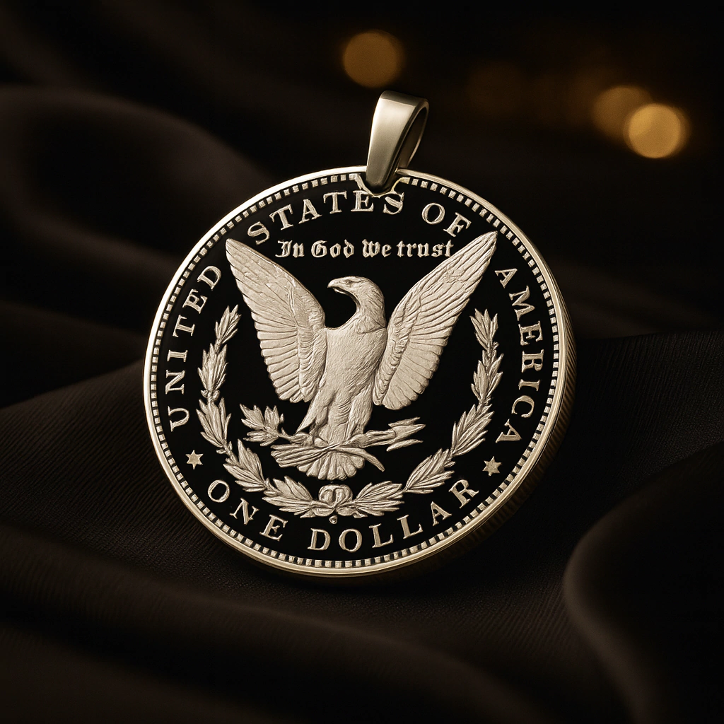 Esta joya única, forjada a mano a partir de una auténtica moneda estadounidense de más de un siglo, captura la esencia del poder y la libertad con un diseño imponente: el águila calva americana.